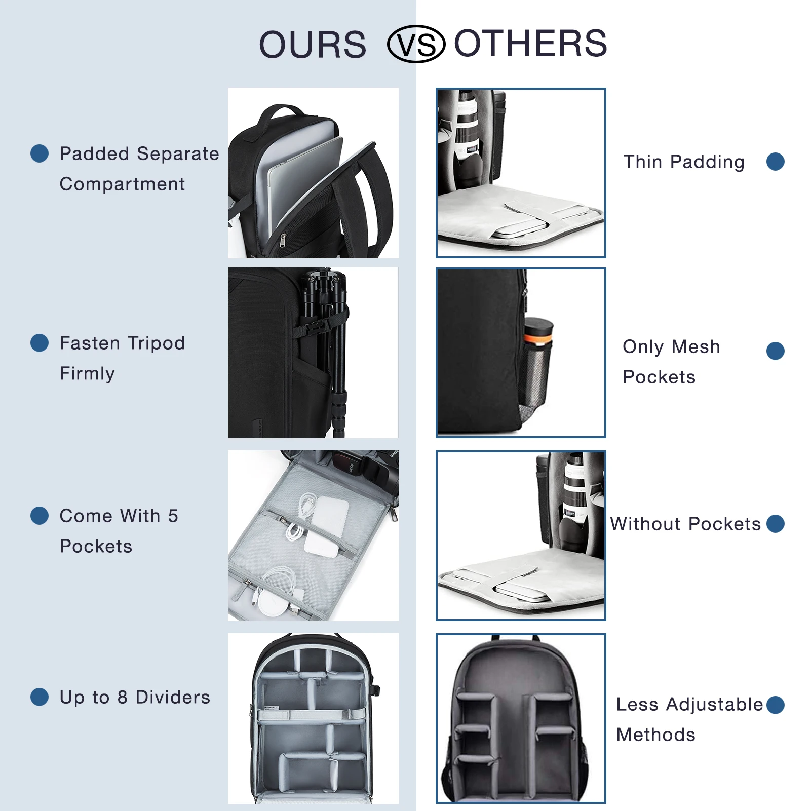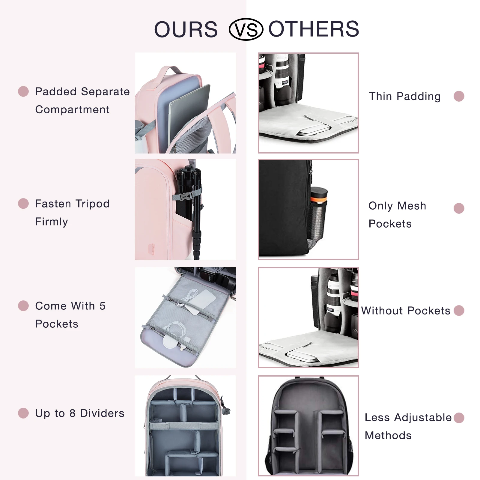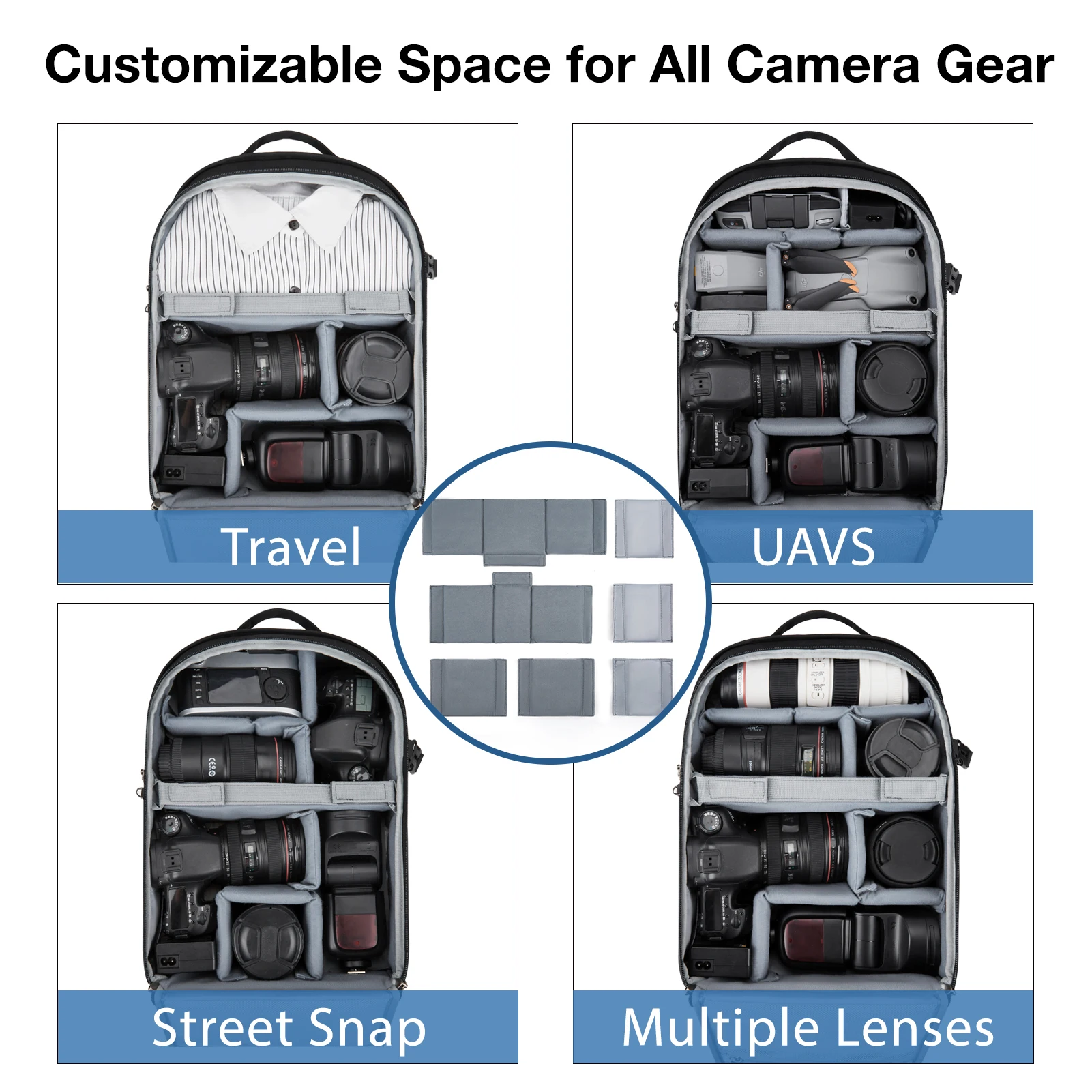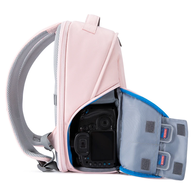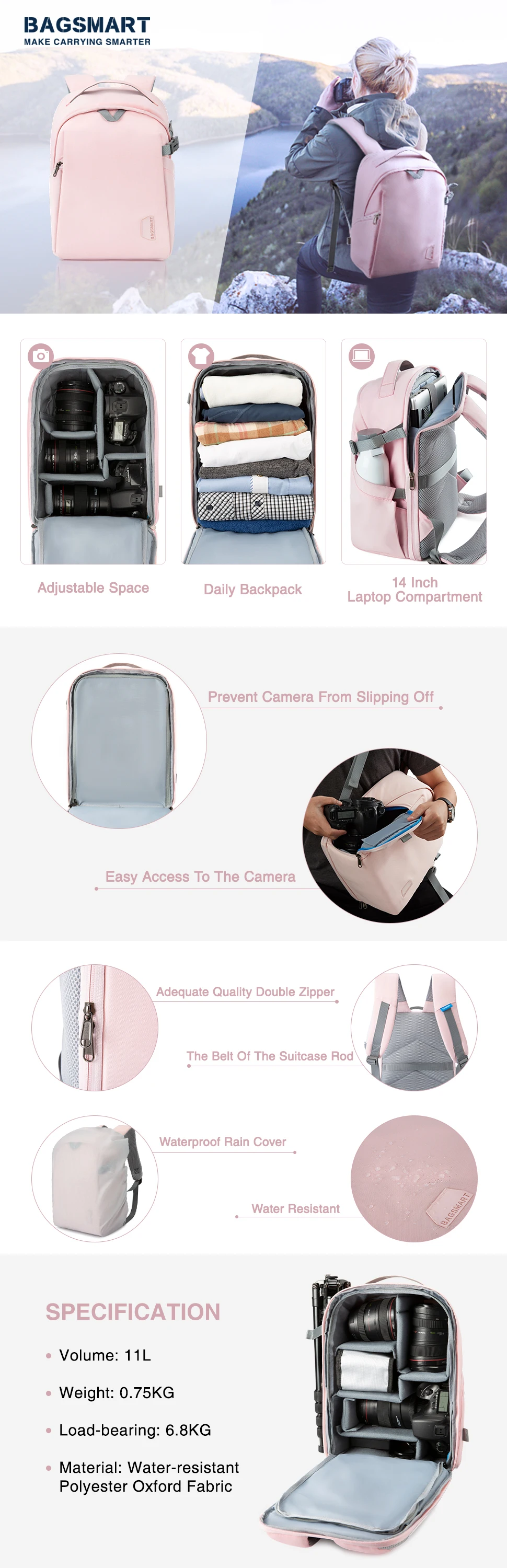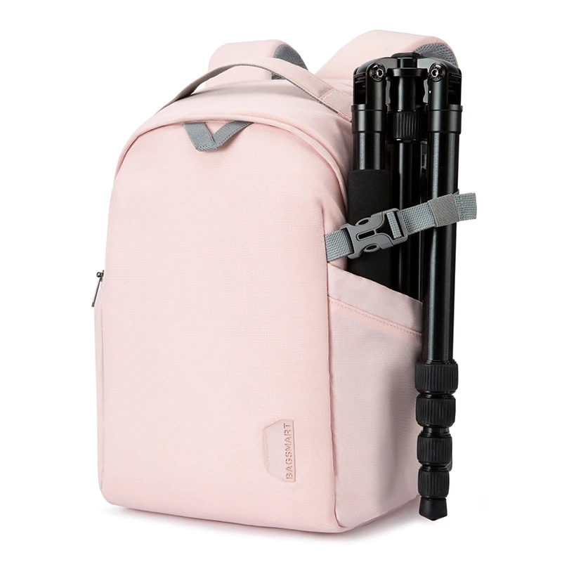 The camera backpack is multi-functional to storage your cameras, tablet, water bottle and other small things. Waterproof material and large capacity, the bag is suitable for outdoors or travel. Also it can be fixed on the suitcase rod for its back belt.