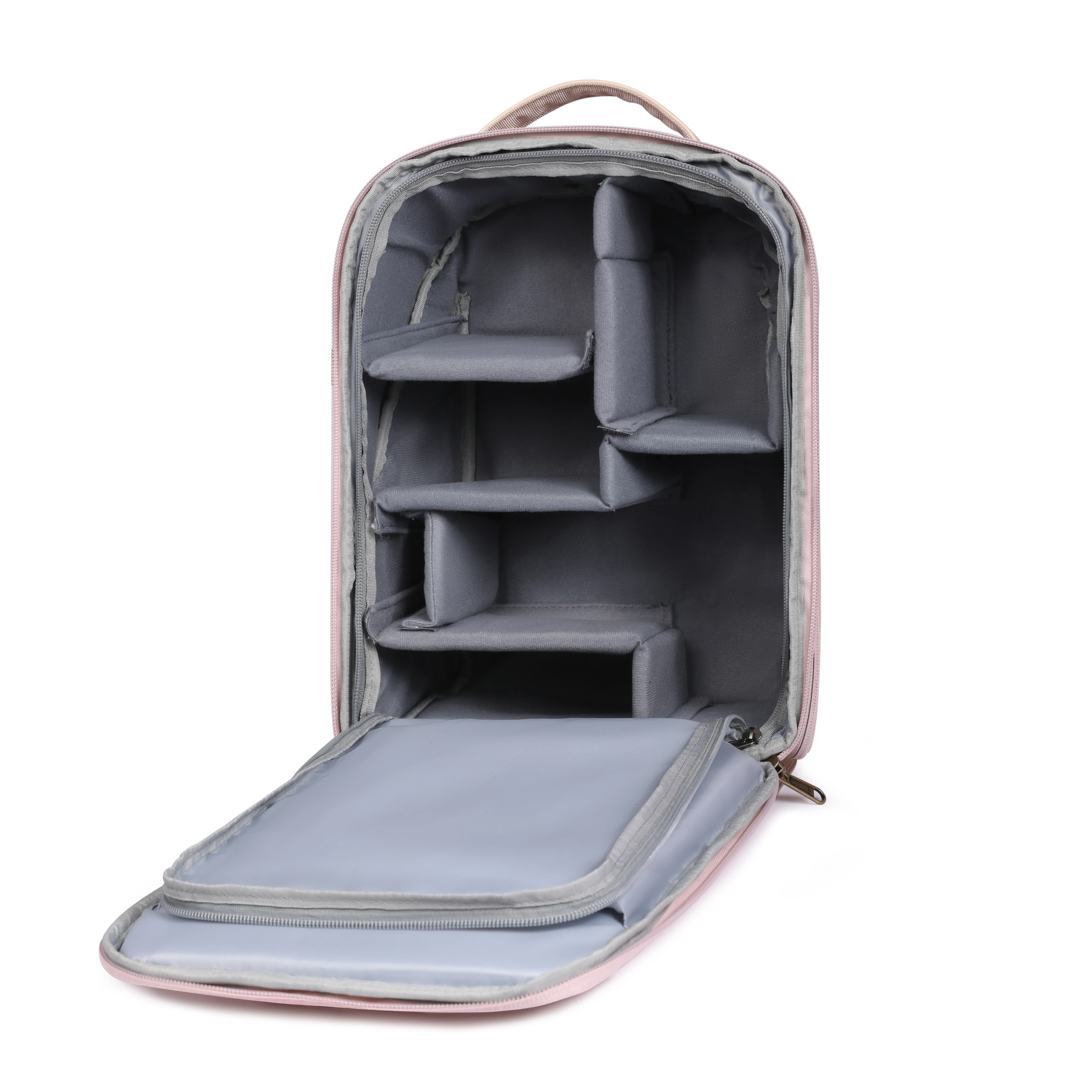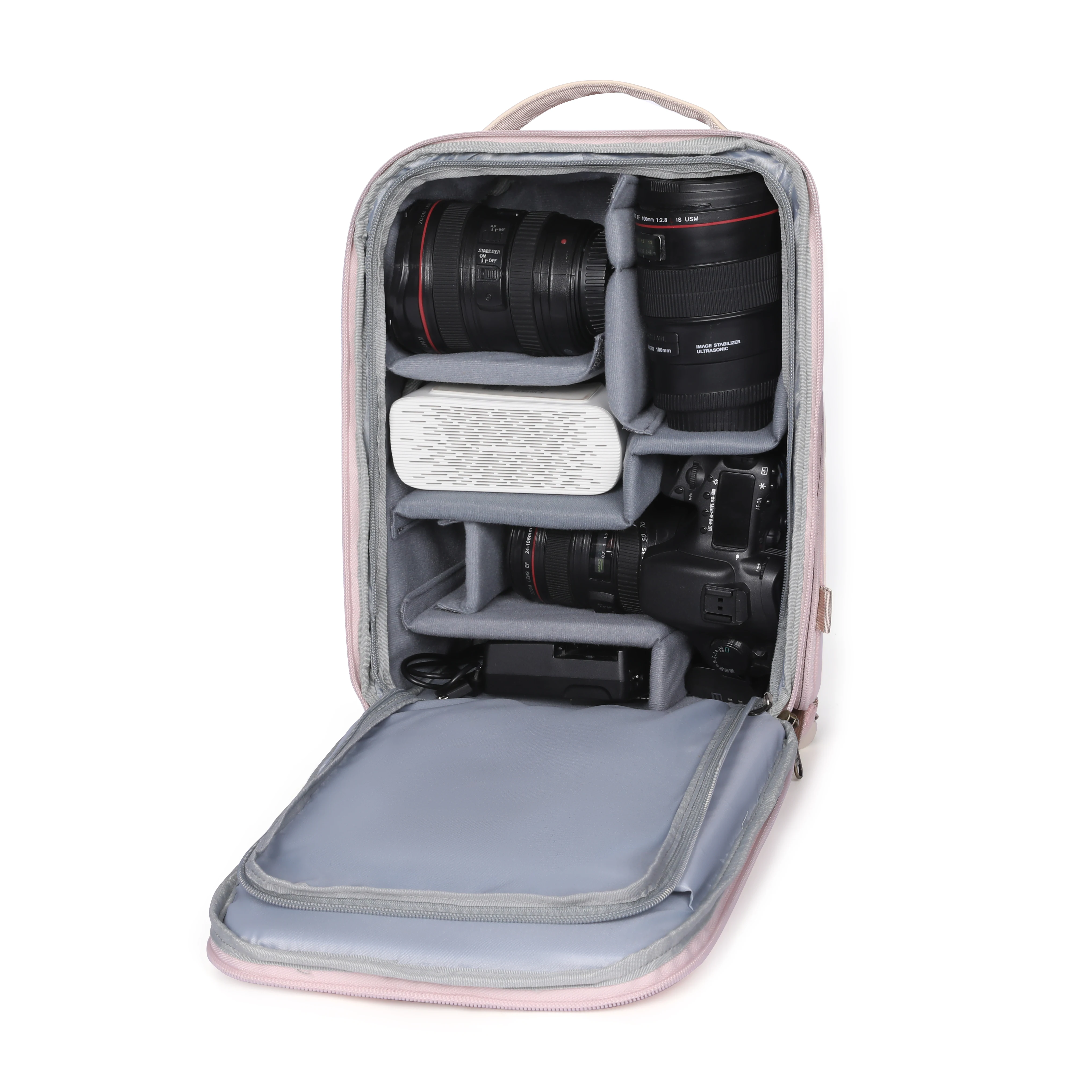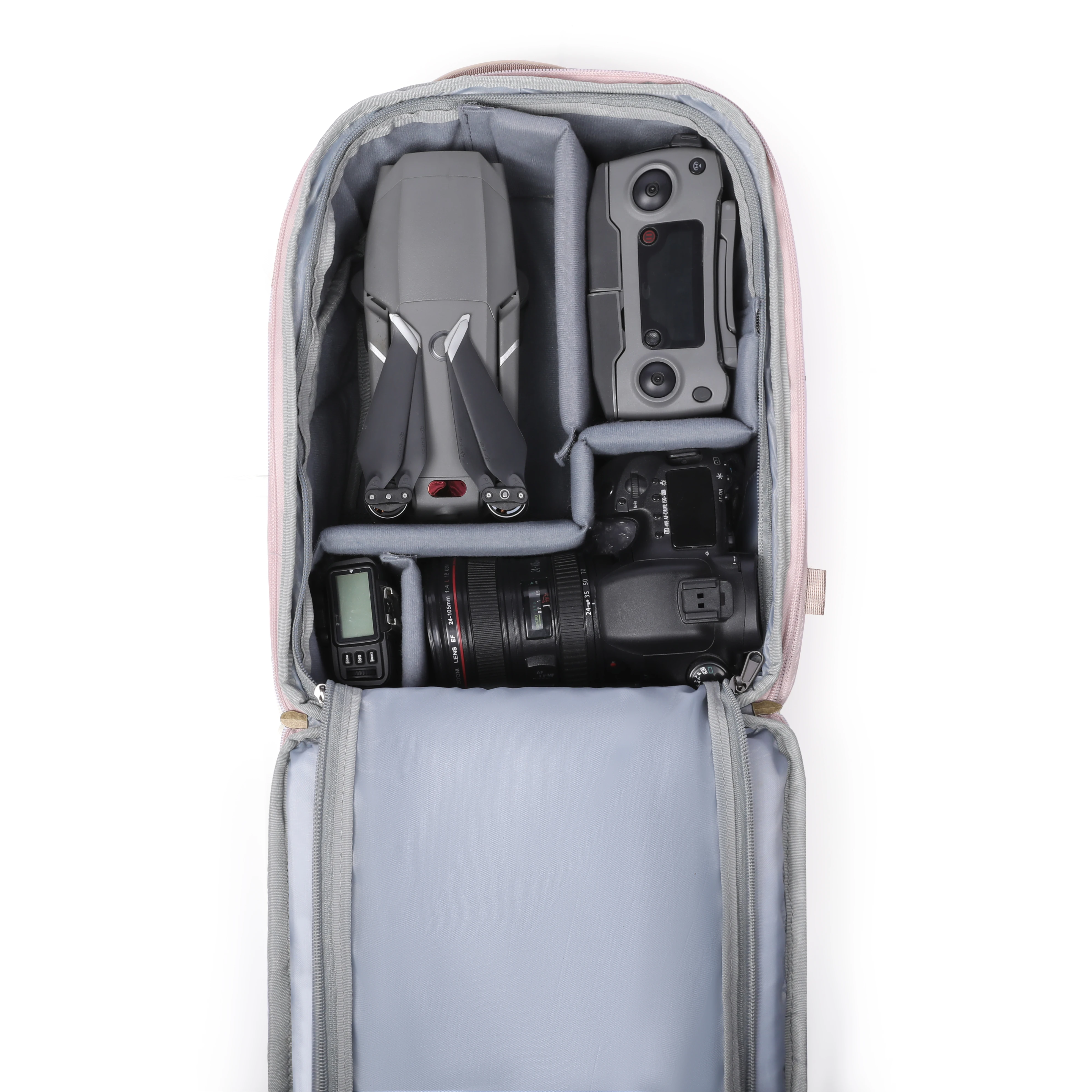 Large capacity inner compartments for organized storage of cameras and other things.