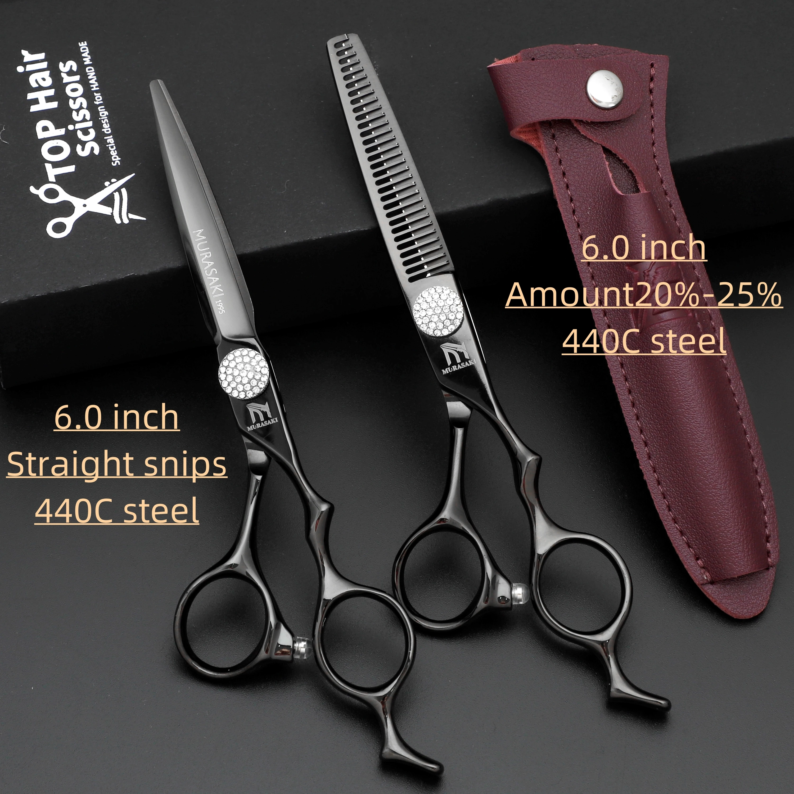 MURASAKI 6.0 inch Black scissors set,Man and woman Hair thinning shears,440C steel hair cutting machines,Barber shop accessories