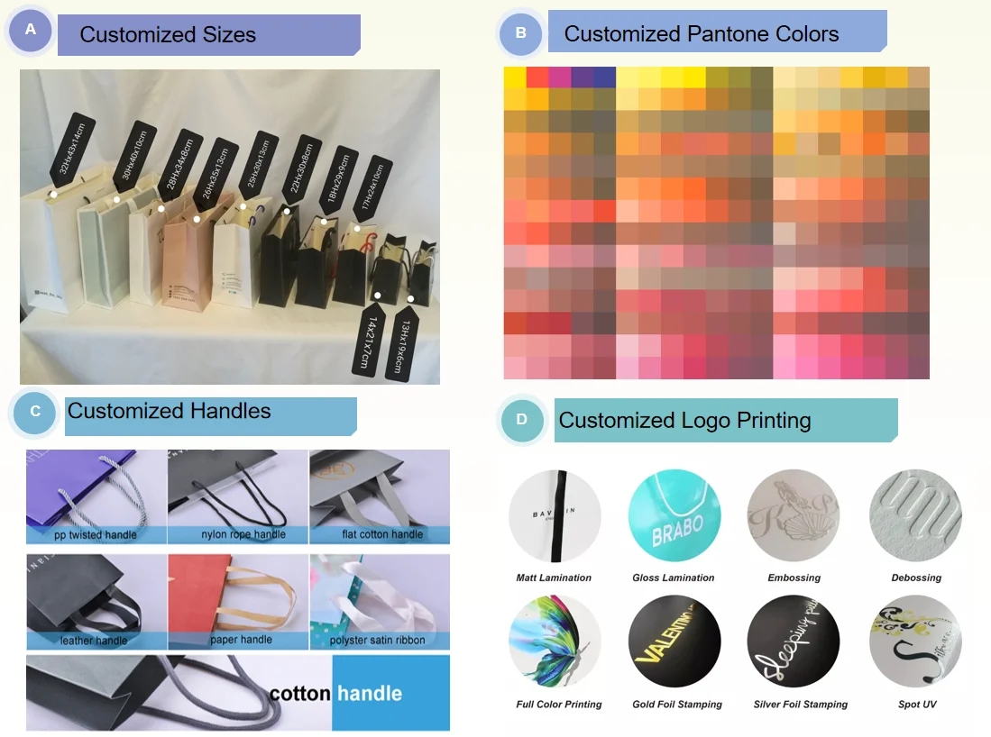 A: Gift Paper bags,Paper boxes,Mailer Bags,Non Woven Bags,Cotton Bags,Plastic Bags,Felt Bag,Hang tags etc.